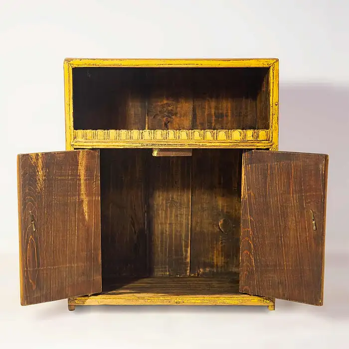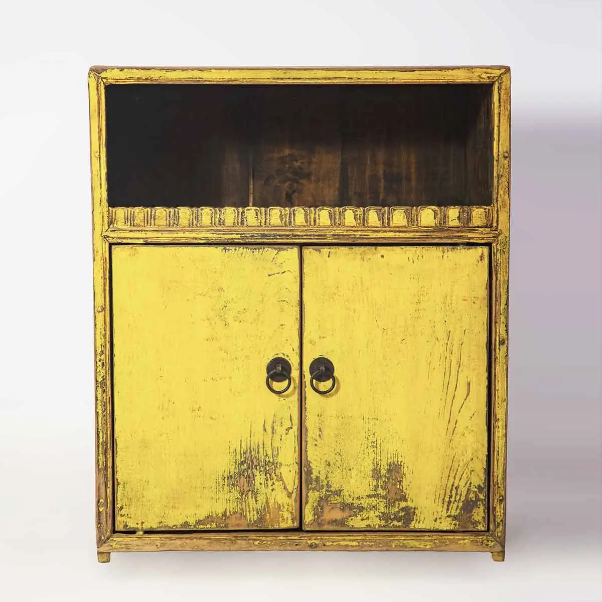 Side cabinet with two doors lacquered in yellow. From China in the first half of 1900. Conservative restoration.